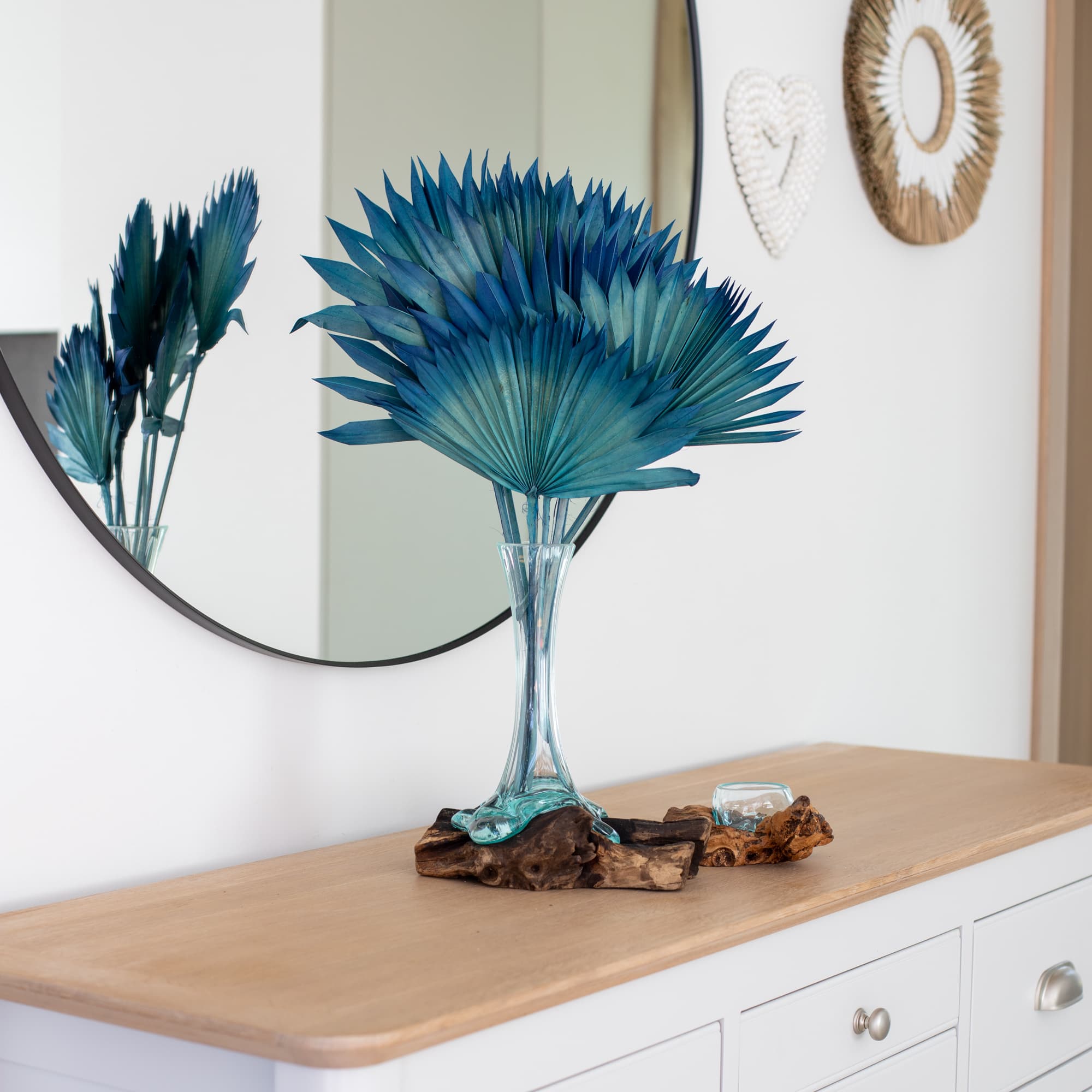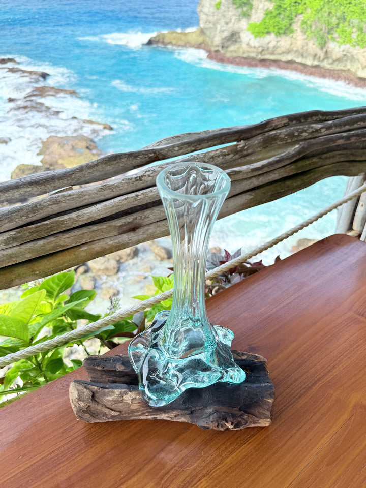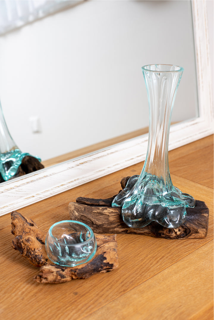 Handmade from clear glass, formed on a natural wooden base, the Bali Rain vase stands out for its organic shape and unique character - each vase is one-of-a-kind.