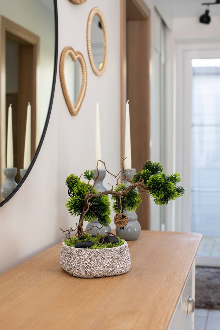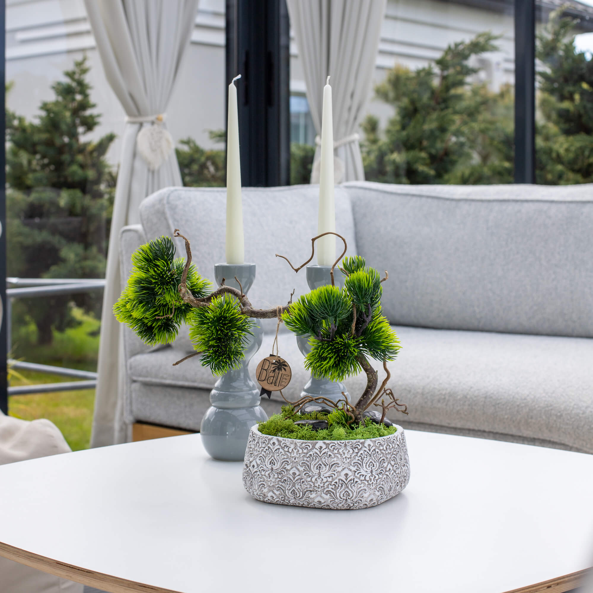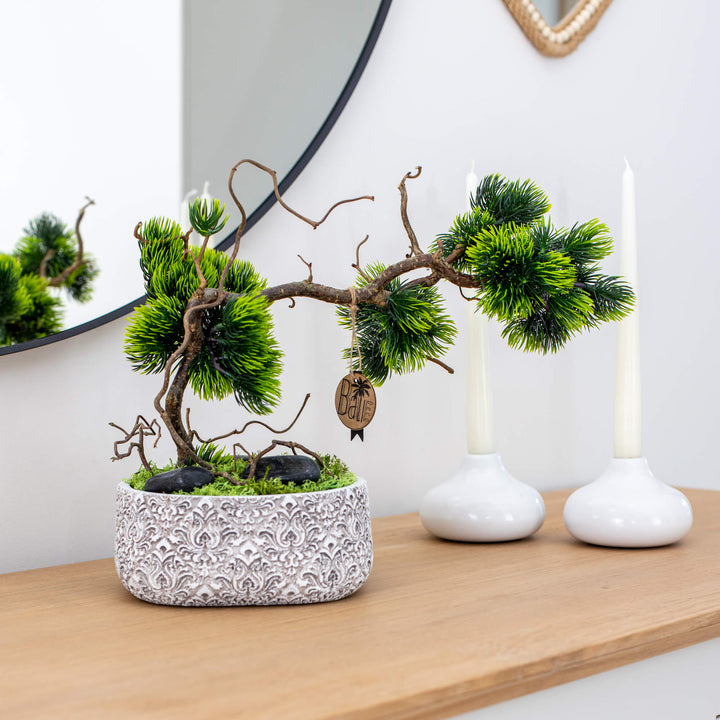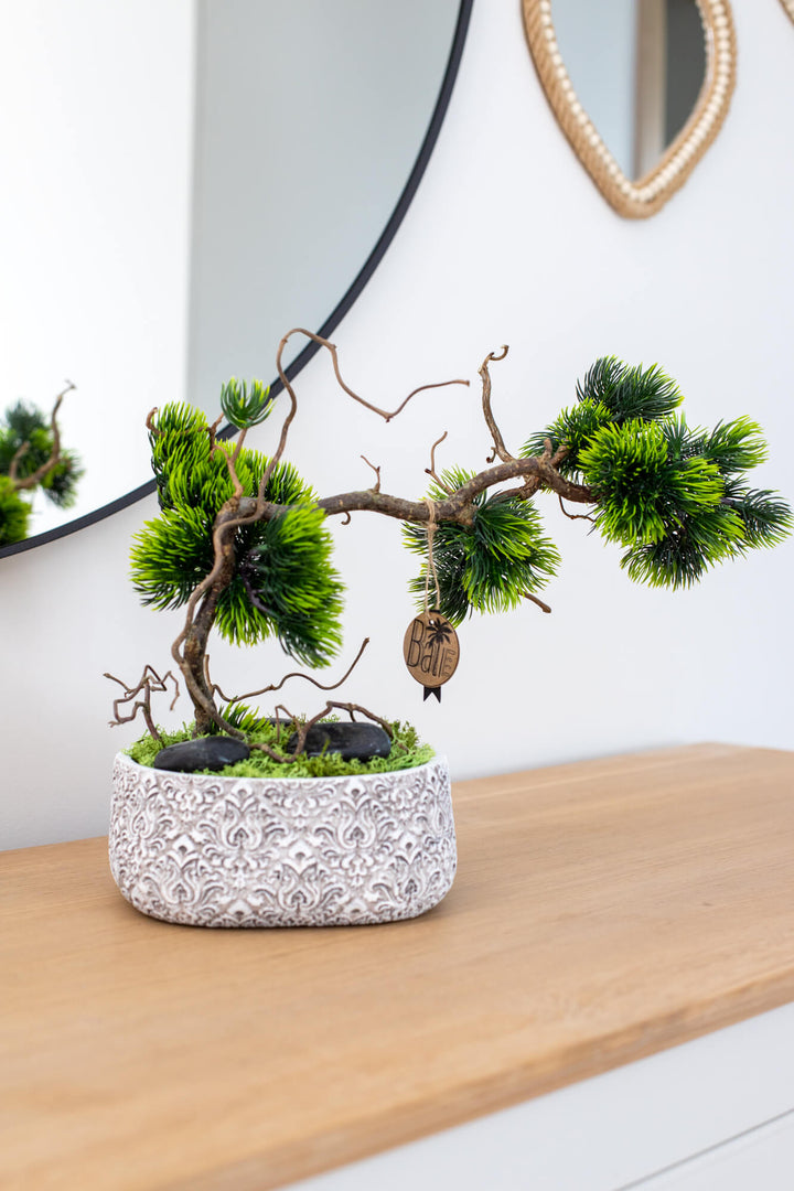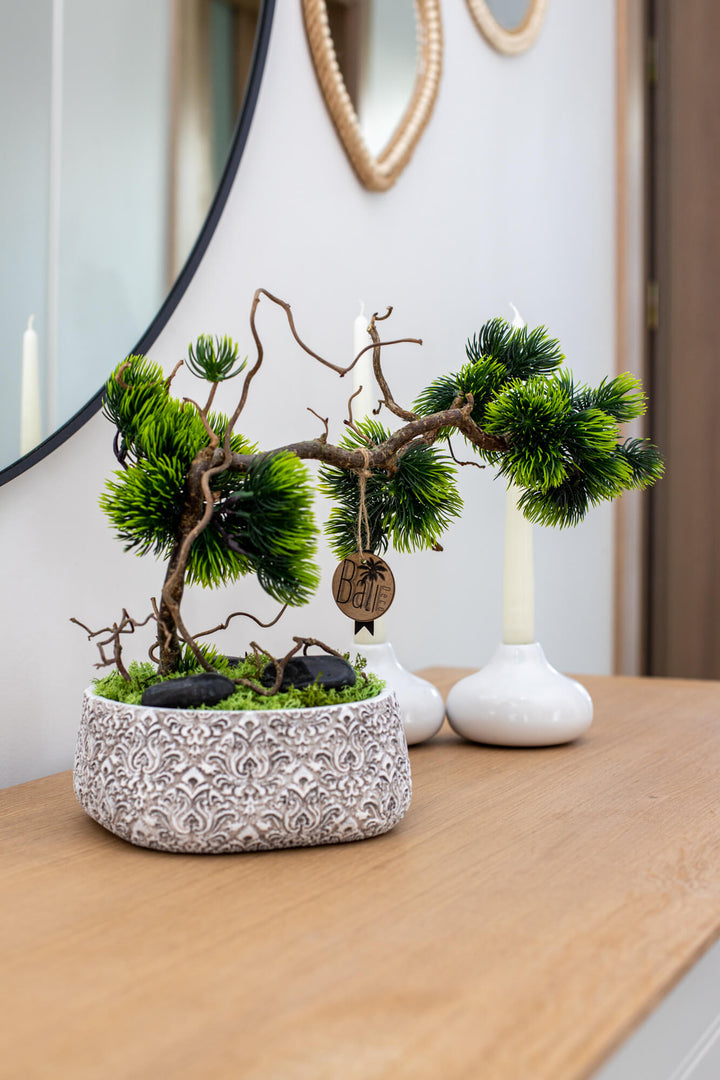 Inspired by oriental aesthetics and the tropical spirit of Bali, this artificial bonsai tree is not only an interior accent, but also a symbol of harmony in your environment. Housed in a uniquely designed embossed ceramic pot, it is perfect for both modern, bohemian or classic-style interiors.