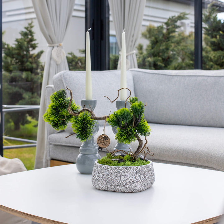 Artificial bonsai with realistic branch arrangement - rich green needle-like branches are formed by naturally curved branches.