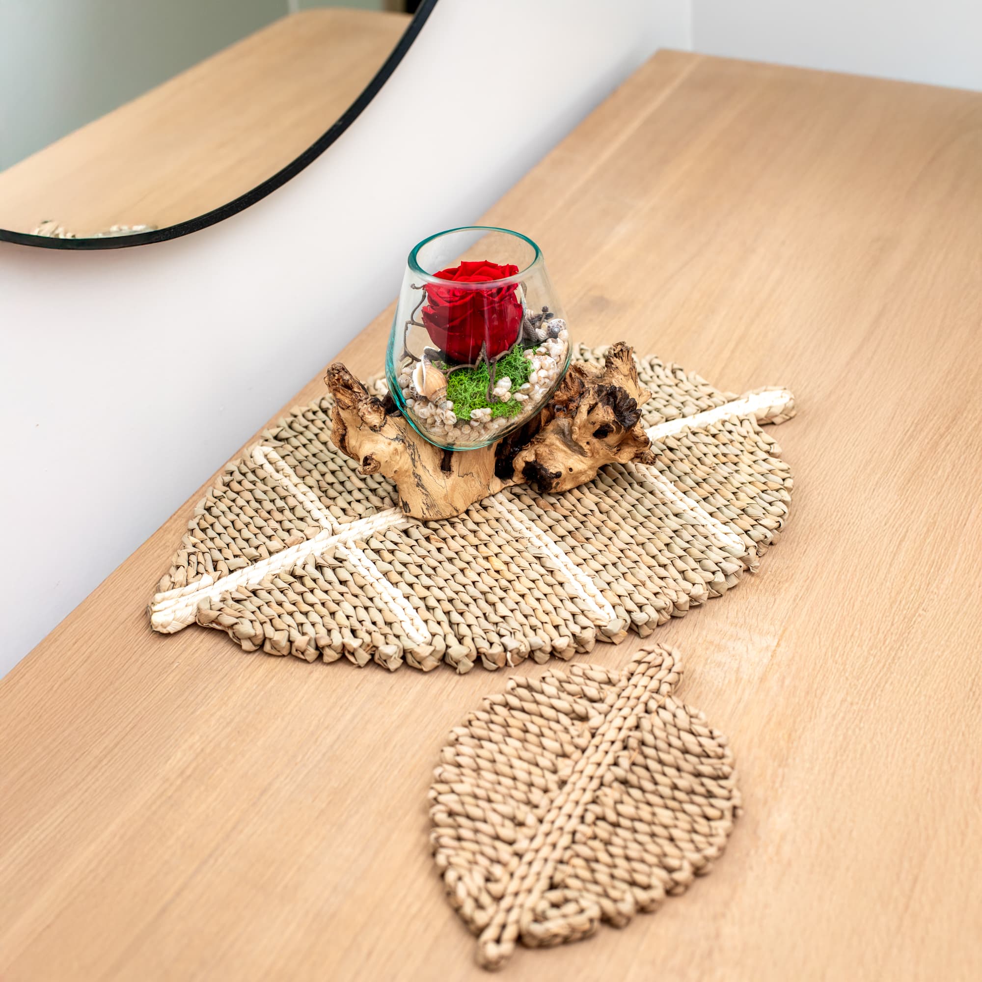 These coasters are made from natural plant materials, imitate the shape of a leaf, and are perfect for interior decoration, as well as as coasters for candles, cups, vases, or other decorative elements.