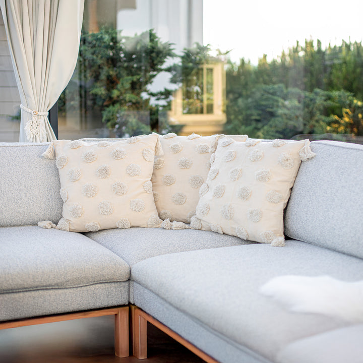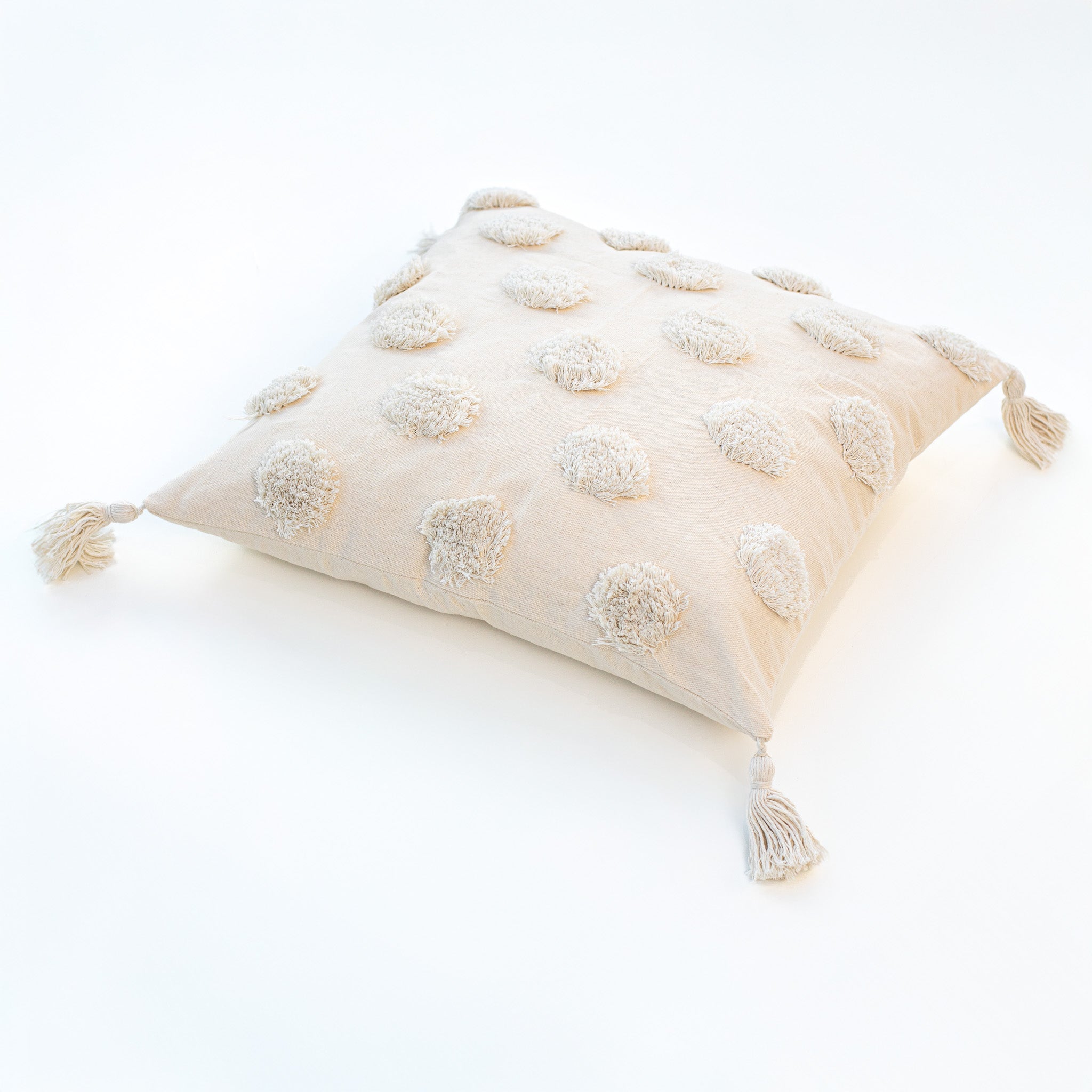 Bring warmth and style to your home with these light decorative cushions. Made from soft, pleasant-to-the-touch cotton fabric, the cushions are adorned with subtle textured pom-poms and tassels at the corners, adding lightness and playfulness to your interior. The neutral sandy shade easily complements a variety of interior styles – from modern to bohemian.