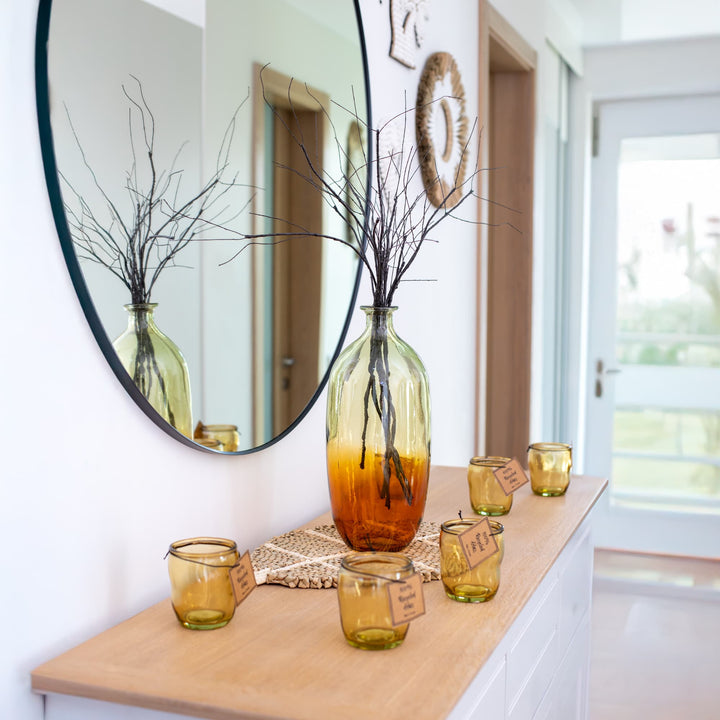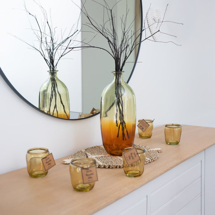 Inspired by the sunsets and natural tranquility of the tropical island of Bali, the Balinese Sun glass candlesticks will bring a sense of comfort, light, and subtle exoticism to your space.