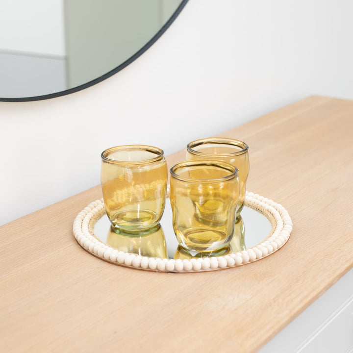 Natural shades – warm yellow glass goes well with wood, bamboo, wicker details and other Balinese decor elements.