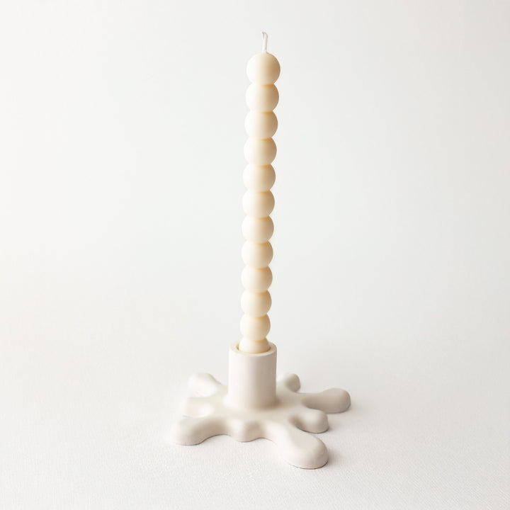 A uniquely designed candle holder that combines modern aesthetics with subtle playfulness. Its form stands out with sculptural lines and a decorative, stable base that provides both visual character and functionality. Perfect for long, decorative candles.